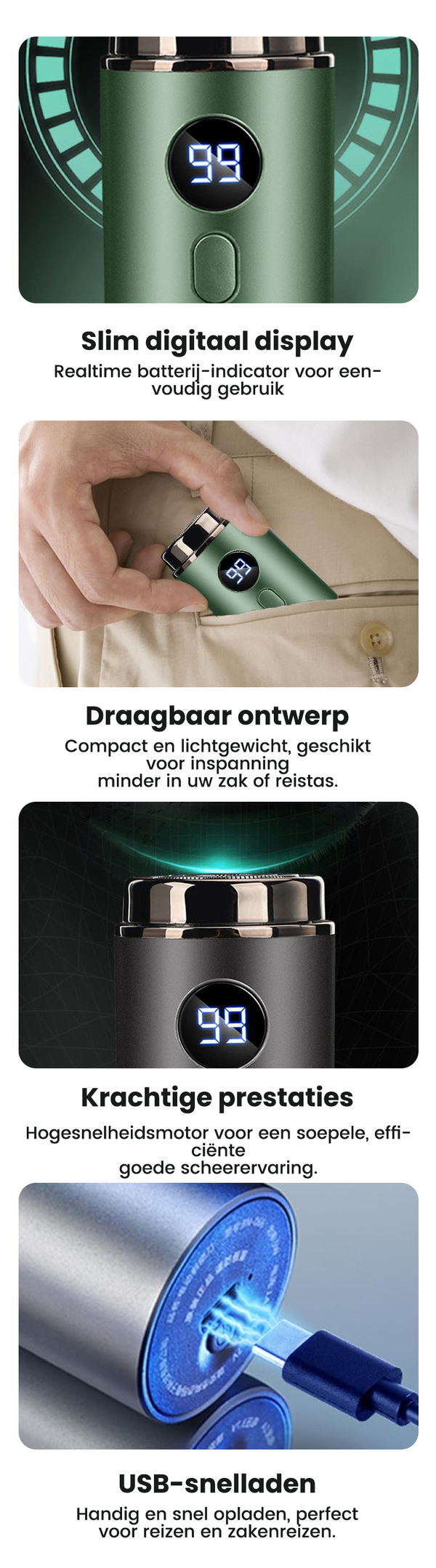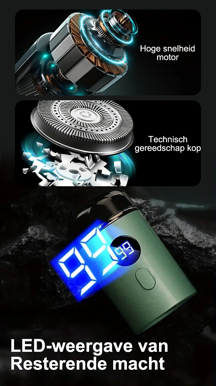 Dit scheerapparaat is zeer doordacht ontworpen, met een digitaal display waarop ik altijd de resterende levensduur van de batterij kan zien. Hij is uiterst handig en gemakkelijk mee te nemen, of u nu op zakenreis of op reis bent!